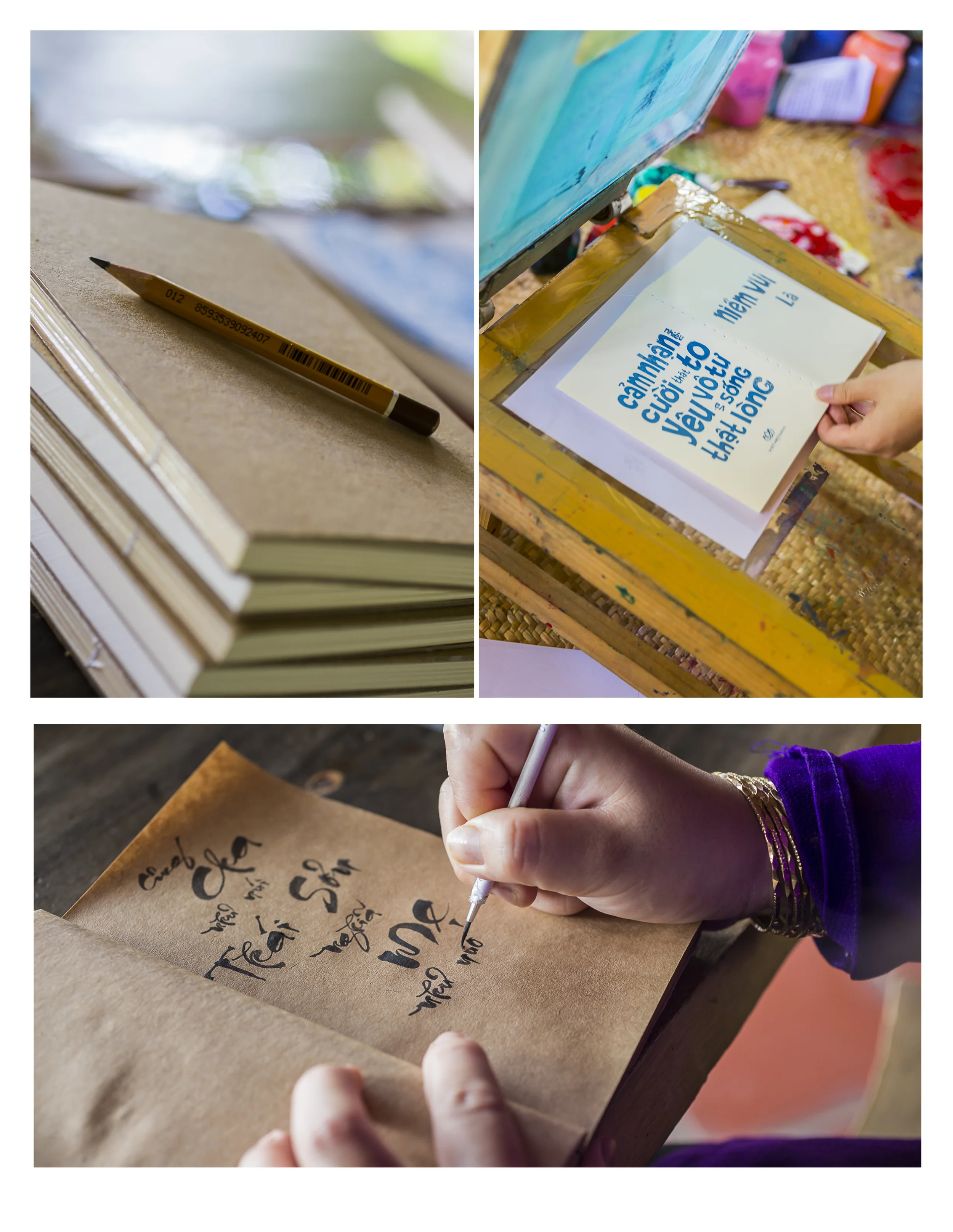 I was very fortunate to spend a day in the Mekong Delta last month to photograph the good work of Lily Phan and Vietartisans. Founded by Lily the organization teaches underprivileged woman skills in calligraphy, silk screen printing and book binding, amongst other things. The women work in a beautiful setting in Vinh Long on the banks of the Mekong where they make the most exquisite gifts with the flavor of Vietnam.